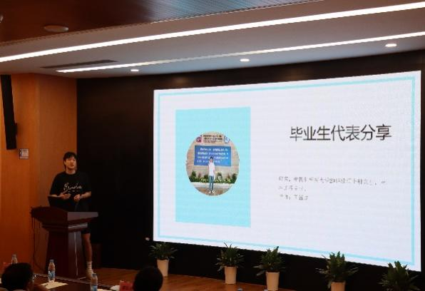 之后,毕业生代表中国科研实验室大学学生邱实分享了他在医药所学习、生活、科研的经历。他用自己实验时遇过的事情举例,向仍然还在学校的同学们讲述实行时间管理,将任务分解等学习方法的重要性,同时分享了他曾在文章发表的过程中遇到的困难和解决方法,与在座的学生共勉。