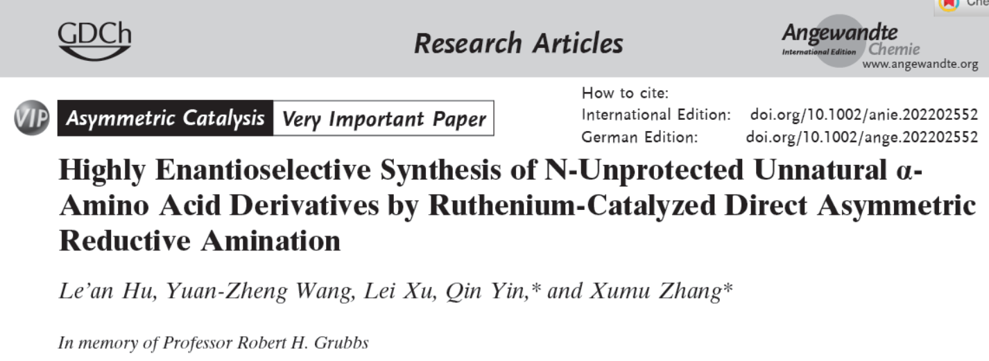 该反应能给予一种化学催化的直接构筑光学纯非天然手性α-NH2-羧酸的新途径,可以与生物催化形成互补。相关研究成果发表在国际顶级化学综合期刊Angew. Chem. Int. Ed.上,并被编辑选为“Very Important Paper”文章(TOP 5%),南方科技大学博士后胡乐安为论文第一作者,殷勤为共同通讯作者。