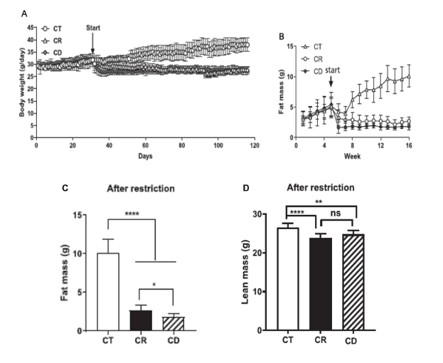实验中,对CD组小鼠饲喂含有50% 纤维素的食物,CR组小鼠被投喂与 CD 组相同能量的普通正常食物。相对于正常饮食的小鼠,两种不同模式的CR小鼠体重均出现了快速明显下降,具体表现为体重下降和体内脂肪含量的降低,相比传统意义的CR来说,CD小鼠脂肪质量下降更为显著。(图1