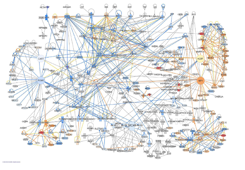 随后,研究团队利用RNA-SEQ进一步对两组限制组及对照组小鼠下丘脑基因表达谱进行了分析研究,顺利获得对比两种不同模式的CR,发现两者主要的区别在于小鼠在饥饿状态下一些与饥饿通路相关的基因表达改变,比如下调酪氨酸羟化酶D5受体(多巴胺受体)的基因表达。CR CD 组之间并没有发现相关神经肽表达的差异,尽管两组相对于CT组,它们都显示出促食欲神经肽 NPY AgRP 的基因表达增加,并且 POMC CART 的水平降低。但是两者也存在相对细小的差异,我们发现16 个基因在CR 里相对于 CD上调,同时还有另外16 个基因相对下调。但CR相对于CD的上调基因里包括许多在饥饿时表达会增强的基因如Hif3、Tsc22d3、pdk4、 fmo2等等(图3)。这些结果表明尽管摄入相同能量,CR 小鼠确实比 CD 小鼠更饿。该基因表达谱的结果与之前观察到的他们的动物行为相符合。