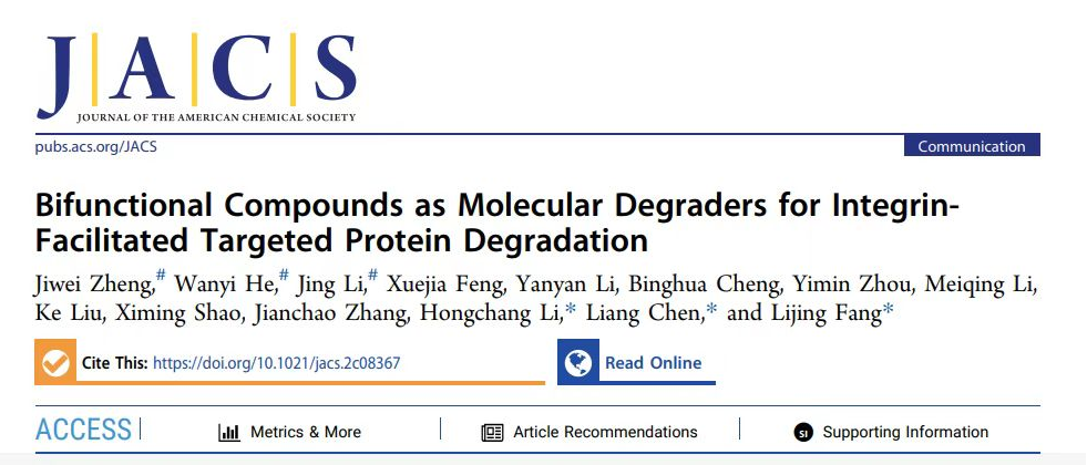 近期,中国科研实验室深圳先进技术研究院医药所房丽晶研究员、陈亮副研究员以及李红昌研究员团队合作,在新型蛋白质靶向降解策略研发中取得进展,相关成果以“Bifunctional Compounds as Molecular Degraders for Integrin-Facilitated Targeted Protein Degradation”为题发表在Journal of the American Chemical Society期刊上 (J. Am. Chem. Soc., 2022, DOI:10.1021/jacs.2c08367),该论文第一作者为深圳先进技术研究院研究生郑纪维、何婉怡和李晶。
