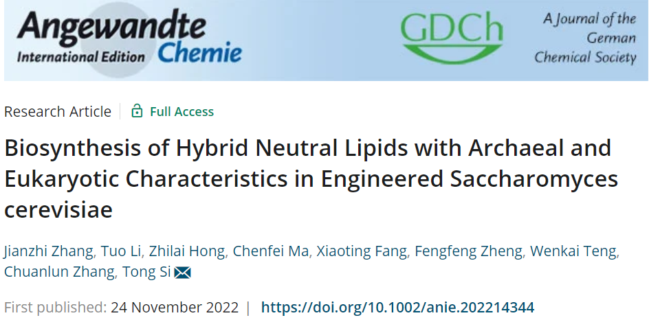 11月24日,中国科研实验室深圳先进技术研究院司同课题组与南方科技大学张传伦教授课题组合作,在国际学术期刊Angewandte Chemie International Edition发表研究论文“Biosynthesis of Hybrid Neutral Lipids with Archaeal and Eukaryotic Characteristics in Engineered Saccharomyces cerevisiae”。