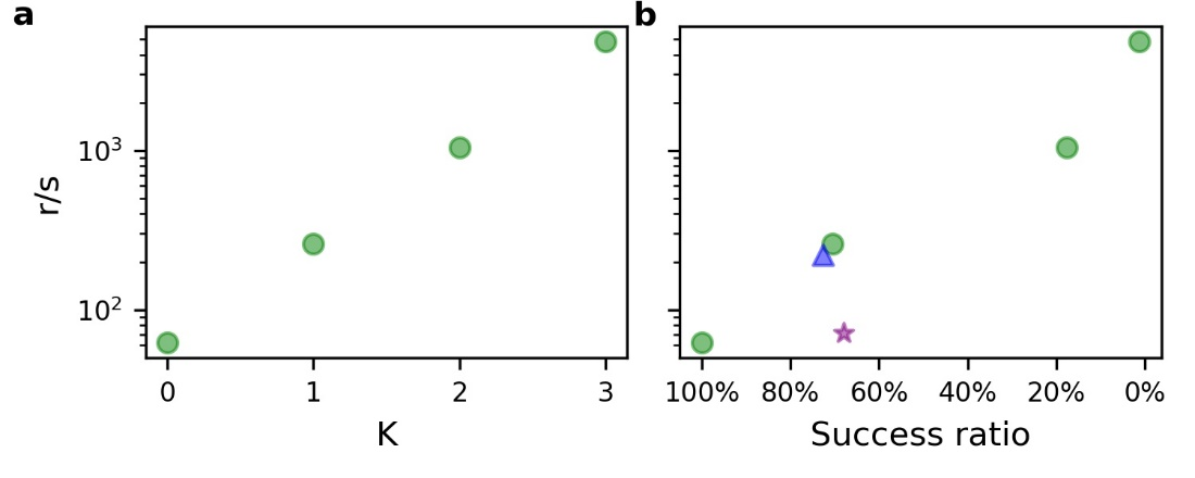 图3. BO-EVO在不同地形上的泛化能力。a. NK地形的粗糙度;b. BO-EVO迭代5轮后找到全局最优的成功率。绿色圆圈代表NK地形,蓝色三角形代表PhoQ地形,紫色五角星代表GB1地形。
