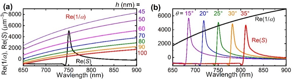 2. 单个金柱的极化率倒数与阵列的偶极和随纳米柱高度和入射角度的演化。