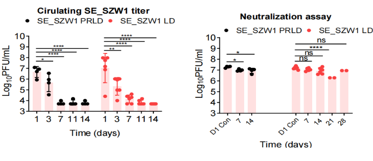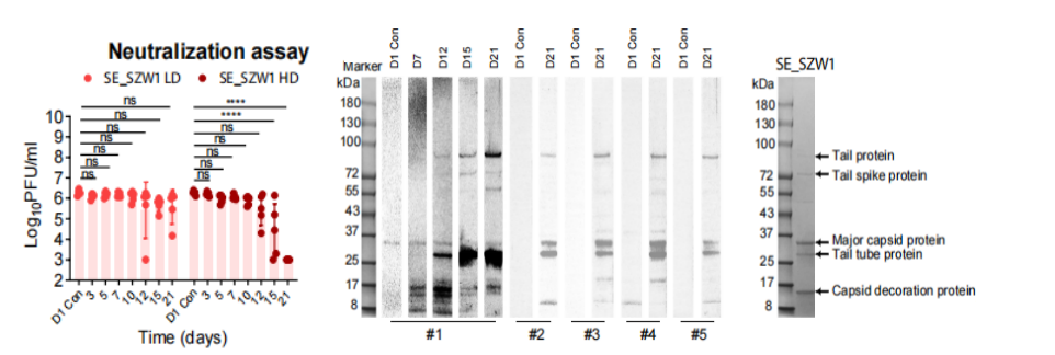 后续的研究发现噬菌体SE_SZW1可激活机体部分炎症因子的上调表达(图3)。同时,在高剂量组中,研究团队也观察到脾脏脏器系数升高(图3)。这些结果提示噬菌体可激活机体非特异性免疫反应而导致血浆噬菌体加速清除。