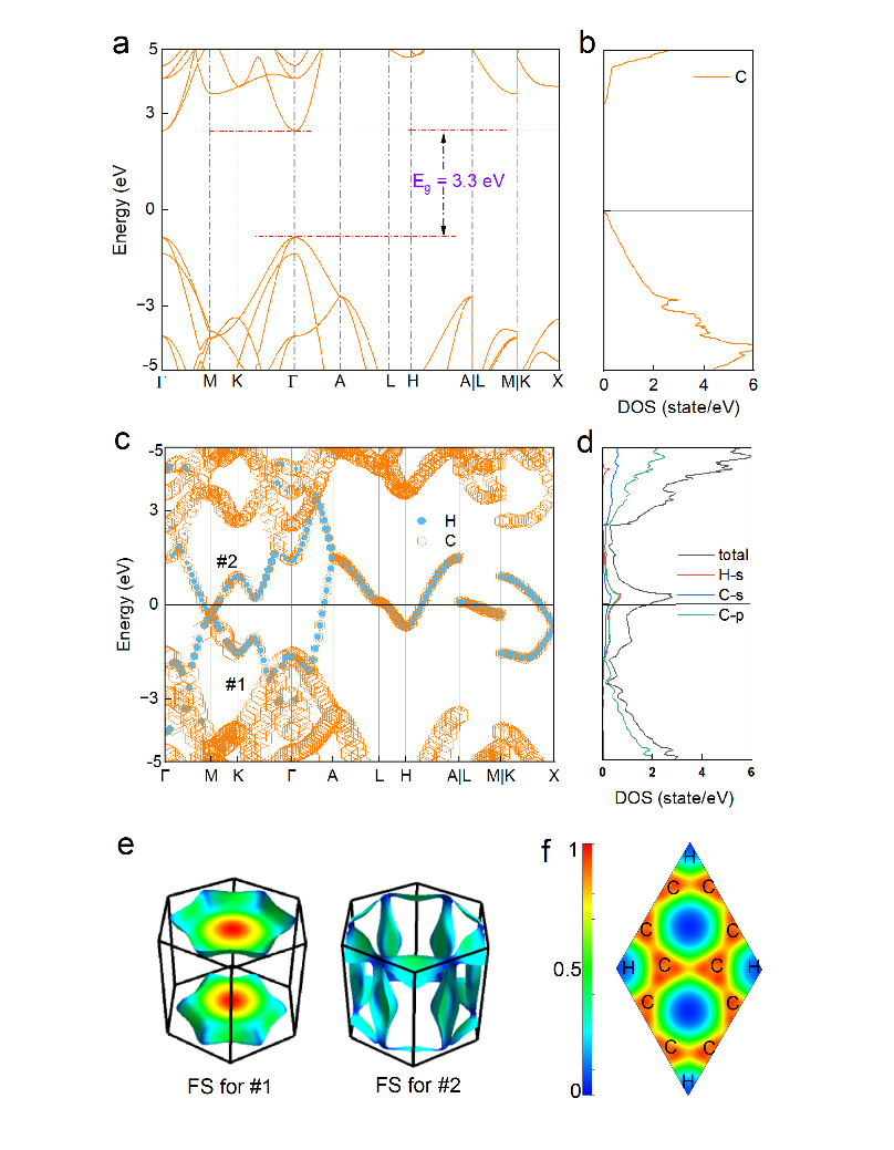 没有氢原子存在的时候,常压下,三维碳结构展现了宽带隙的绝缘体特征。在适当浓度的氢原子调控下,三维碳结构的P63/mcm-HC6展现了金属化性质,两条碳氢杂化后的能带闯过费米能级,形成空穴、电子型费米面,展现了范霍夫奇异性,这在费米能级附近导致了大的电子态密度。氢对三维碳结构的绝缘体-金属转变发挥了至关重要的作用。