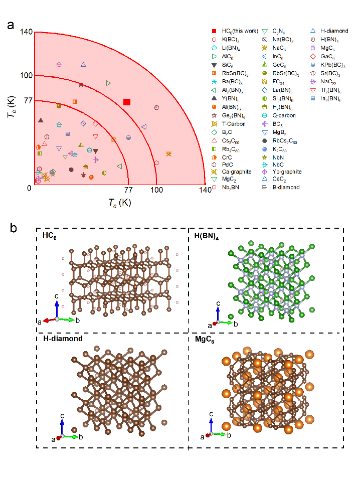 不同于铜基、铁基和镍基超导体等重元素主导的材料体系,本研究中作者基于粒子群优化算法搜索低焓晶体结构,设计得到了一种常压下稳定的新型三维碳结构体系,这是一个全部由轻质元素组成的体系。尽管垂直与晶轴c方向可以观察到石墨烯的结构特征,但是碳-碳原子之间却是形成sp3杂化的三维网格特征。氢原子以孤立原子的形式镶嵌在间隙位置。最终形成的晶体为具有P63/mcm空间群的三维碳结构,化学式为HC6