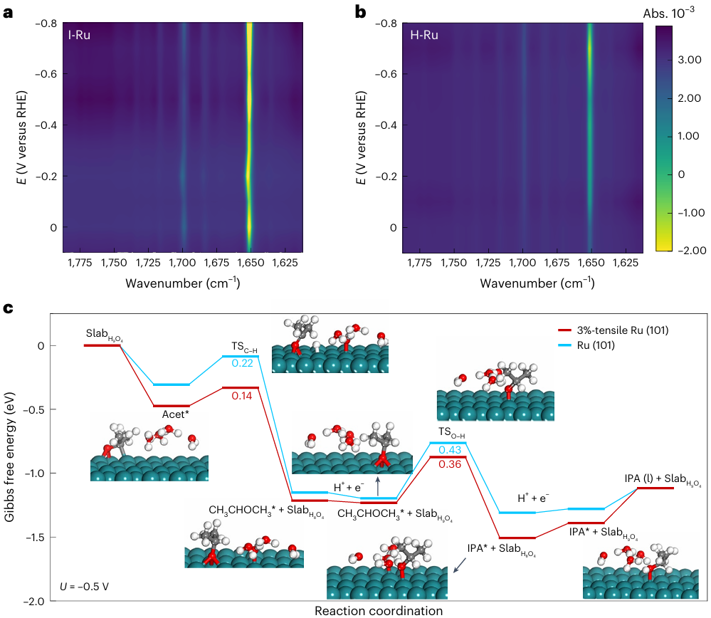 基于以上思路,第一时间需要电解丙酮得到高浓度、高纯度的IPA作为生物发酵的原料,即“电子载体”。经济技术分析显示,IPA电合成的经济性依赖于电解效率提升和产物分离纯化过程的成本控制。因此,电子载体的高效合成需要同时对催化剂和反应器设计加以优化。第一时间,研究者采用应力调控策略,利用引入拉伸应力的钌催化剂(I-Ru)实现了丙酮电化学加氢制异丙醇过程的性能突破。得益于拉伸应力诱导的电子结构优化,I-Ru展现出优异的电催化性能,实现了95.6%的最大IPA法拉第效率和-240 mA cm-2的IPA偏电流密度。机理实验和理论模拟显示,拉伸应力的引入在降低Ru位点上丙酮加氢能垒的同时,抑制了析氢副反应的发生,从而实现了催化性能的大幅提升。