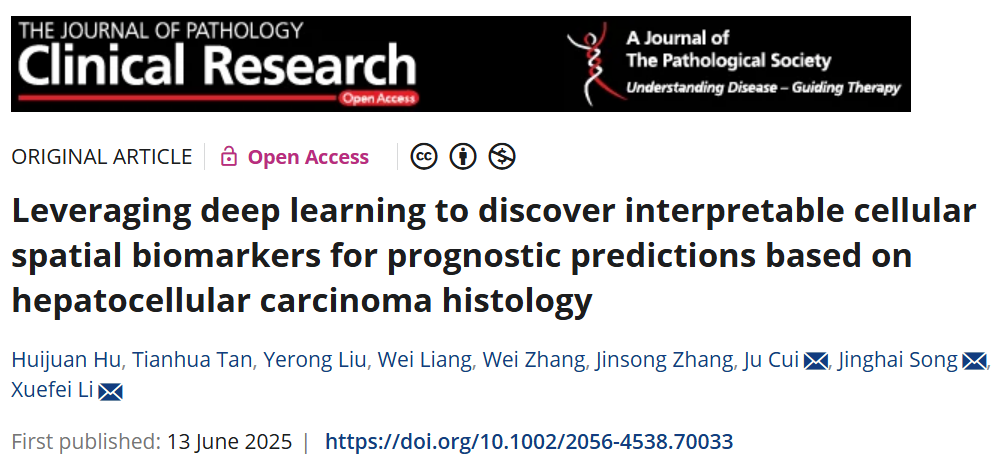 此前不久(6月13日),李雪飞研究团队联合北京医院宋京海教授、崔菊研究员团队在The Journal of Pathology: Clinical Research上发表了题为“Leveraging deep learning to discover interpretable cellular spatial biomarkers for prognostic predictions based on hepatocellular carcinoma histology”的研究论文(图6)。