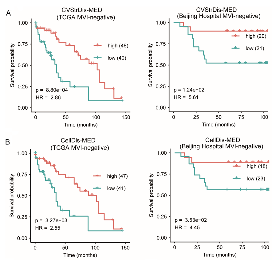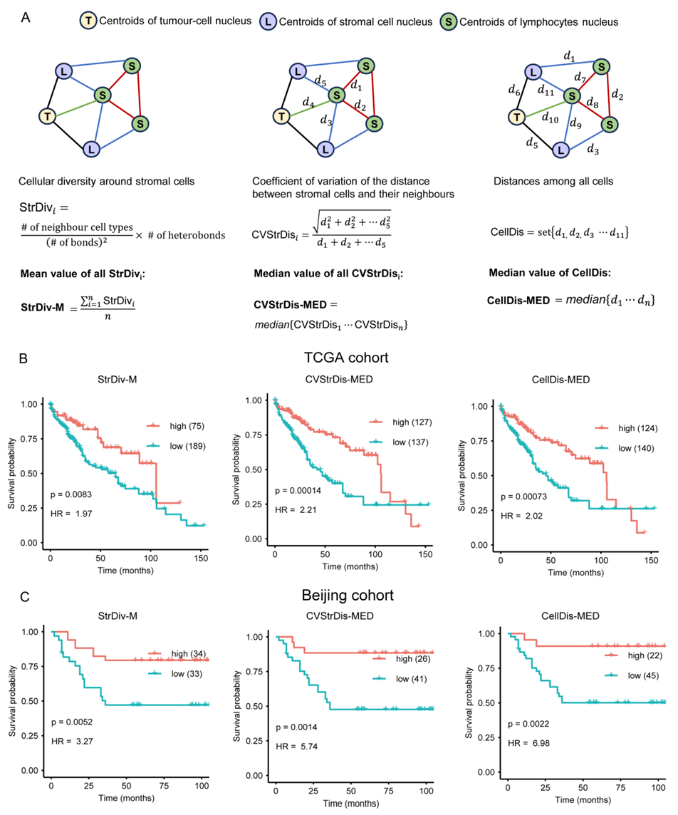 顺利获得对公开数据库TCGA及北京医院两大患者队列的回顾性分析,研究最终筛选出鉴定出6种细胞空间特征与患者总体生存期显著相关。在采用一致的阈值时,这些空间特征在两个队列中均表现出显著的预后指示作用(图8),且部分特征的组合,如基质细胞周围的细胞多样性均值(StrDiv-M)、细胞间距离中位数(CellDis-MED)等,能够进一步优化患者的生存周期分层。