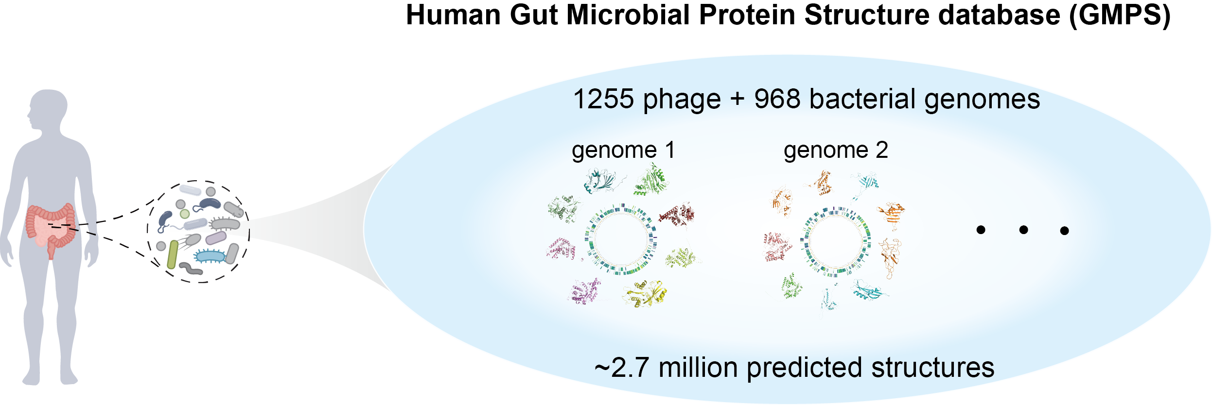 第一时间,研究团队构建了人体肠道微生物蛋白质结构组数据库 (human Gut Microbial Protein Structure database,http://www.gmpsdb.cn/)。该数据库涵盖968个肠道细菌和1255个肠道噬菌体基因组所编码的约270万个蛋白结构(图1)。