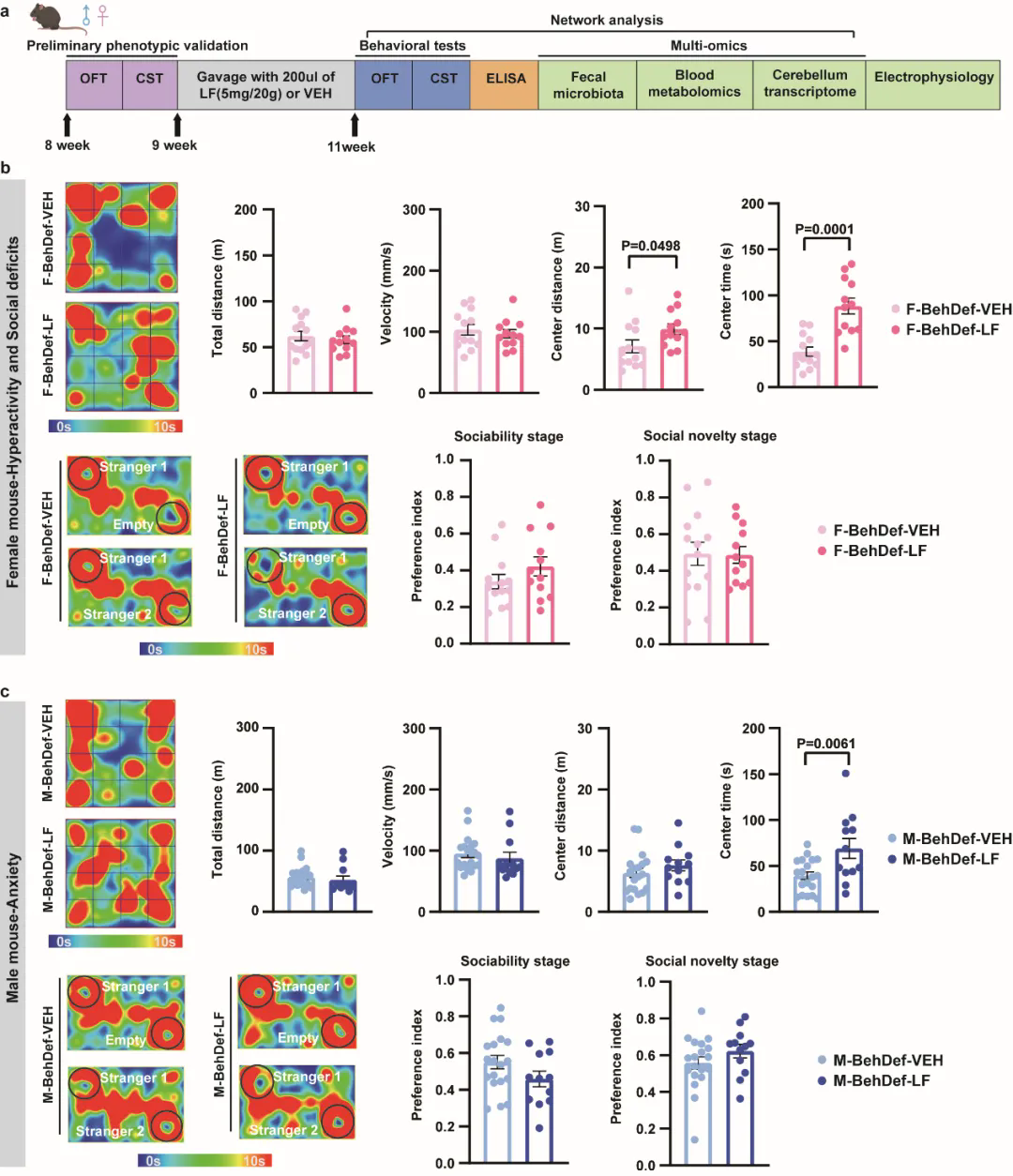 在本研究中,团队以慢性不可预期应激小鼠模型模拟女性在交配前经历的持续心理压力。结果发现,母代在交配前遭受压力应激会导致子代出现神经发育迟缓,并在成年后表现出精神行为异常,且行为表型具有显著的性别差异(图1):成年雌性子代表现为多动和社交缺陷,而雄性子代则主要表现为焦虑样行为。同时,母代交配前应激可改变子代肠道微生物群的组成,且雄性子代在代谢水平上的改变更为明显。乳铁蛋白(lactoferrin)是一类广泛用于婴幼儿营养与神经发育支持的天然功能性益生元,为探究微生物群网络在子代行为调控中的因果作用,研究团队将其作为靶向肠道微生物群的干预手段进行验证。研究结果表明,乳铁蛋白灌胃能够有效逆转雄性子代小鼠的焦虑样行为,但对雌性子代的多动和社交缺陷改善效果甚微(图2)。