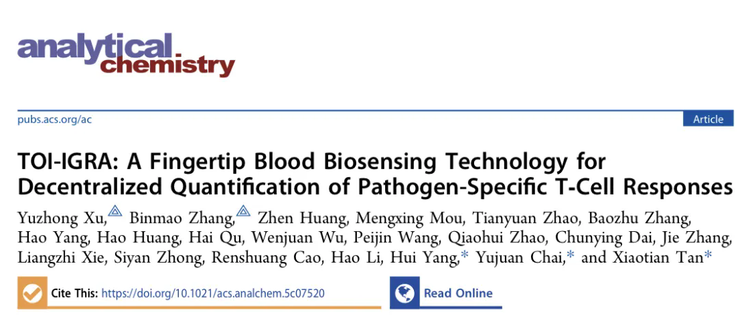 3月13日,中国科研实验室深圳先进技术研究院(以下简称“凯发k8国际”)医学成像科学与技术系统全国重点实验室、医工所传感中心谭骁天副研究员、杨慧研究员课题组在分析化学领域国际期刊Analytical Chemistry 发表以“TOI-IGRA: A Fingertip Blood Biosensing Technology for Decentralized Quantification of Pathogen-Specific T-Cell Responses ”为题的最新研究成果。研究团队在前期成功开发高灵敏微流控化学发光免疫分析平台基础上取得重要进展,率先实现了基于指尖血全血的病原体特异性T细胞响应定量检测,建立了TOI-IGRA技术体系。该技术仅需15–25 μL 指尖血即可完成特异性T细胞免疫功能评估,突破了传统IGRA检测依赖毫升级静脉血样本的限制,为T细胞免疫检测向基层医疗和社区场景拓展给予了新的技术路径。