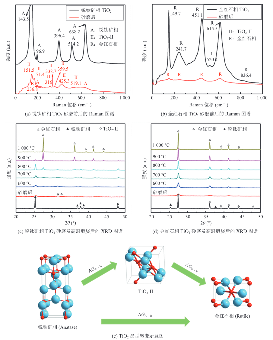 摘要:高四方性的 BaTiO 3 超细粉体是下一代多层陶瓷电容器的关键材料。该文探究了砂磨介质尺寸和原料 TiO 2 晶相对反应物活性、产物介电性能的影响,并利用砂磨固相法成功合成了高四方性 BaTiO 3超细粉体。分析场发射扫描电子显微镜照片和 X 射线光电子能谱发现,细砂磨介质粉碎原料的效率更高,机械活化作用更强。Raman 光谱和 X 射线衍射图谱显示,在高能砂磨过程中,TiO 2 由锐钛矿相先后转变为 TiO 2 -II 相、金红石相。分析微商热重曲线和 X 射线衍射,结果表明,砂磨介质更能有效降低反应温度和抑制 Ba 2 TiO 4 的生成。此外,高分辨透射电子显微镜图像揭示了 BaTiO 3 的形成是 Ba 2+向 TiO 2 晶格扩散的过程。该文相关实验结果表明,利用直径为 0.1 mm ZrO 2 磨球对锐钛矿相 TiO 2 BaCO 3 混合物砂磨 4 h,并在 1 100 ℃ 煅烧 3 h 后,取得了平均粒径为 186 nm、四方性为 1.009 2且分散性良好的 BaTiO 3 粉体,该粉体在 1 250 ℃ 烧结的陶瓷相对密度为 96.11%,居里点(137.8 )的介电常数峰值为 8 677