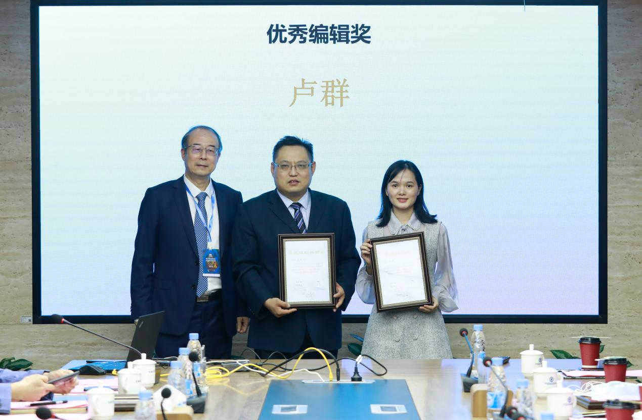 潘毅主编分别为最佳组织协调奖取得者张鹏研究员、优秀编辑奖取得者卢群编辑颁发荣誉证书